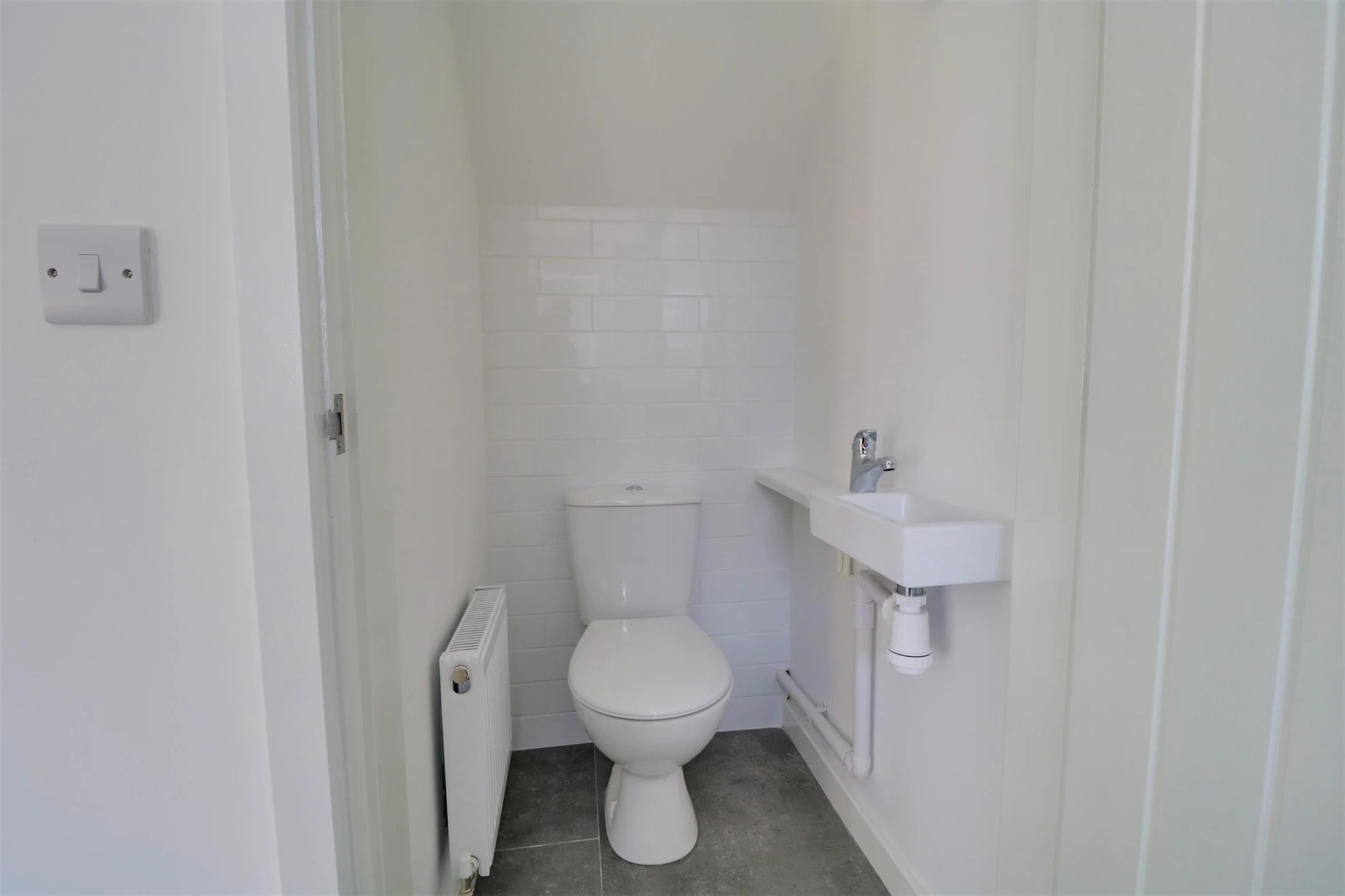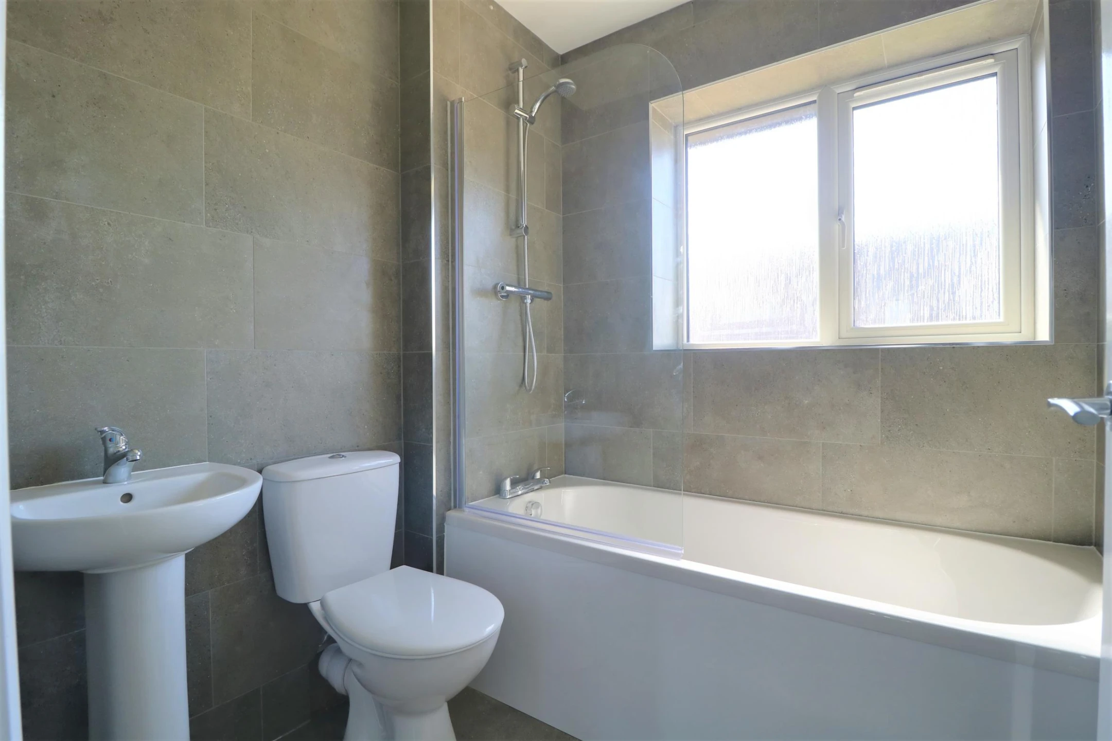 A modern bathroom suite fitted with a panel bath, wash hand basin, close coupled WC. Spotlight to the ceiling. Radiator.