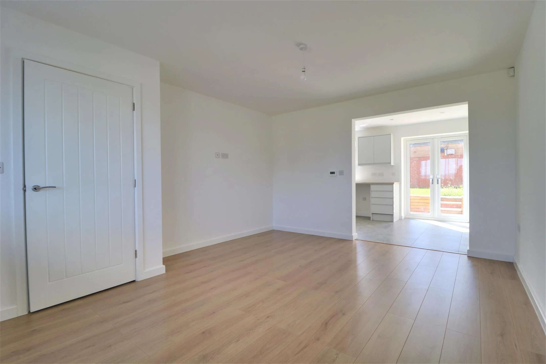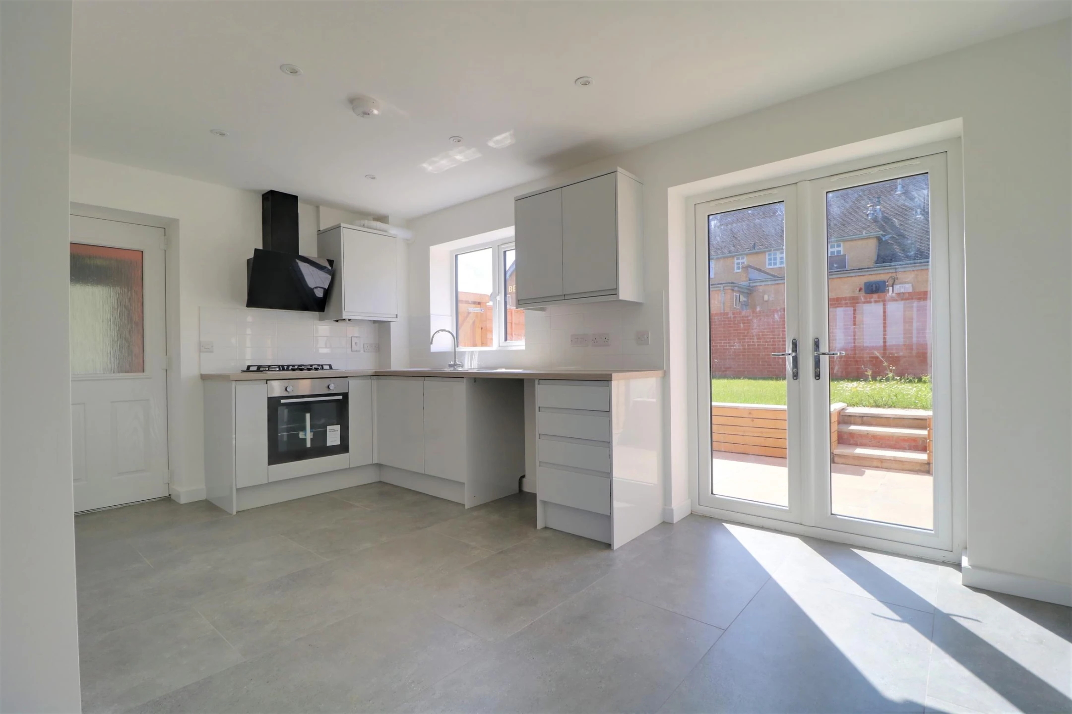 The dining area has Upvc French doors that lead out onto the patio area. Space for a dining table. Spotlights to the ceiling. Radiator. The kitchen area is fitted with a range of modern wall and base units with an integral oven, gas hob and extractor above, dish washer. Sink unit set into work surfaces with tiled splash backs. space for a fridge freezer and washing machine. Further spotlights to the ceiling. Upvc window to the rear and a composite door to the side.