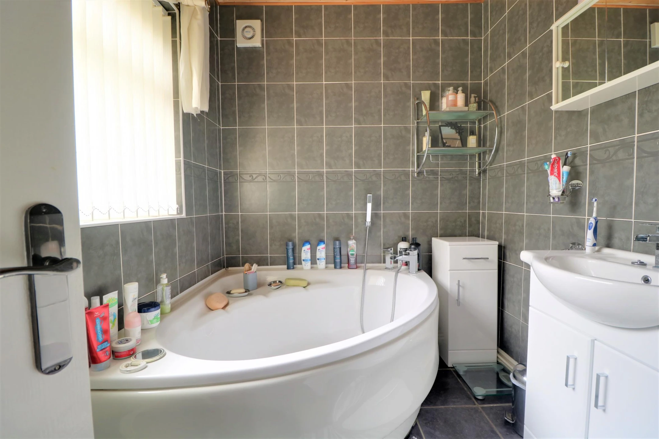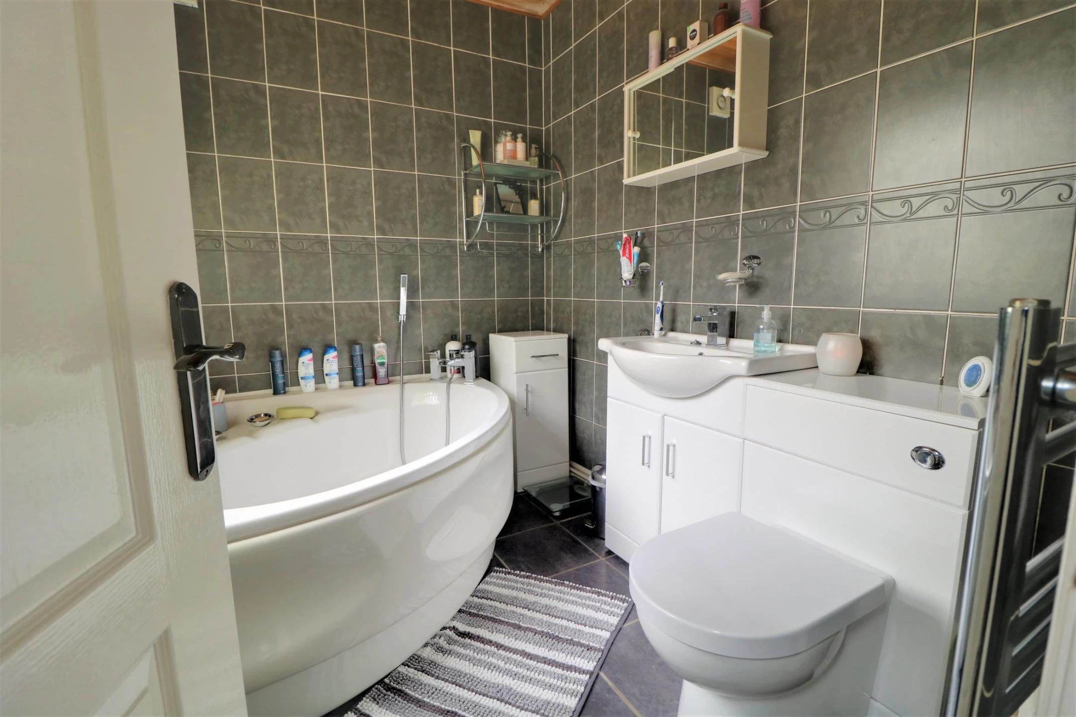 A three piece suite comprising of a corner panelled bath with chrome mixer tap and shower head, vanity wash hand basin and low level WC. Upvc double glazed window to the side aspect, radiator and tiled flooring.