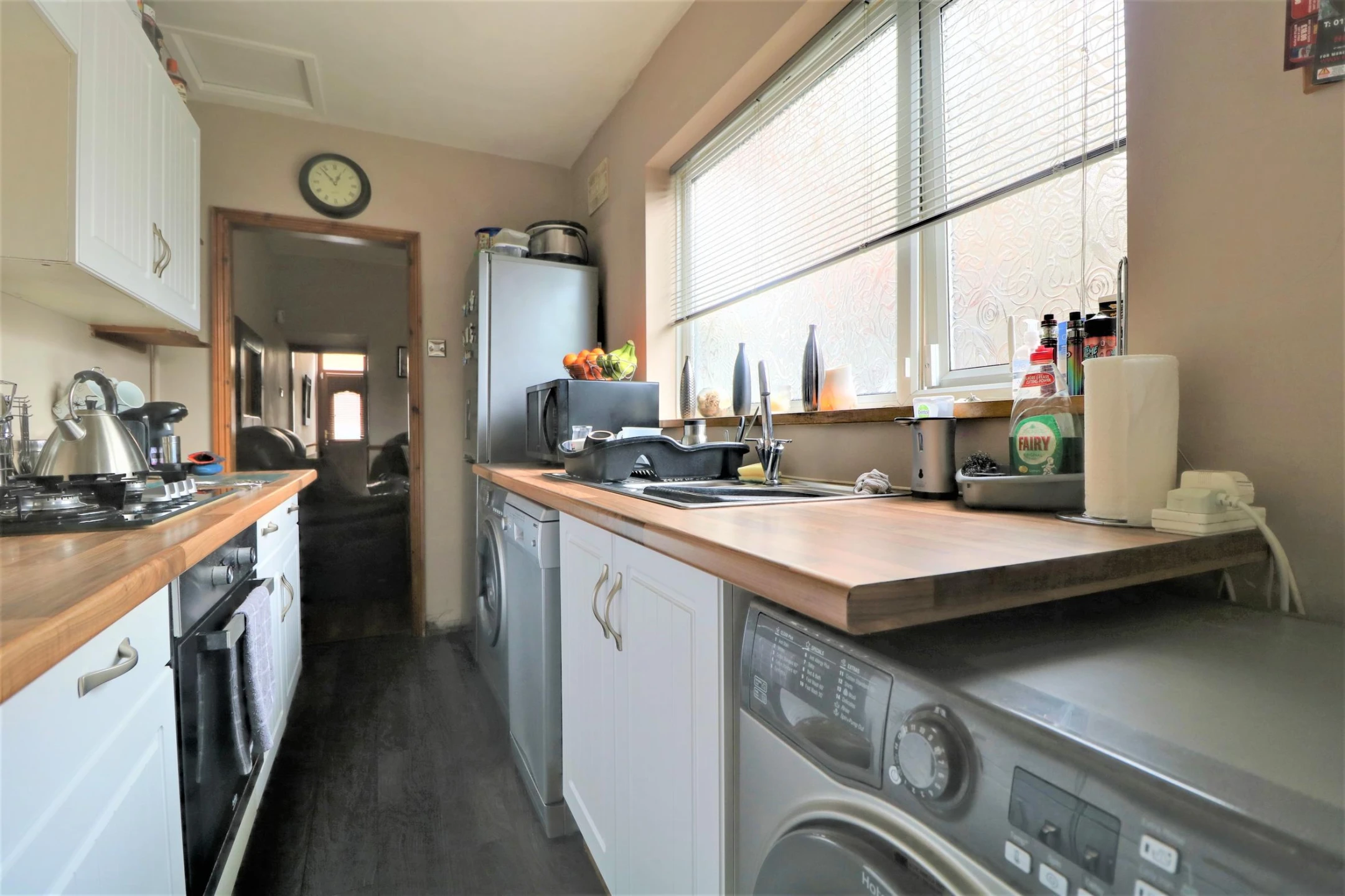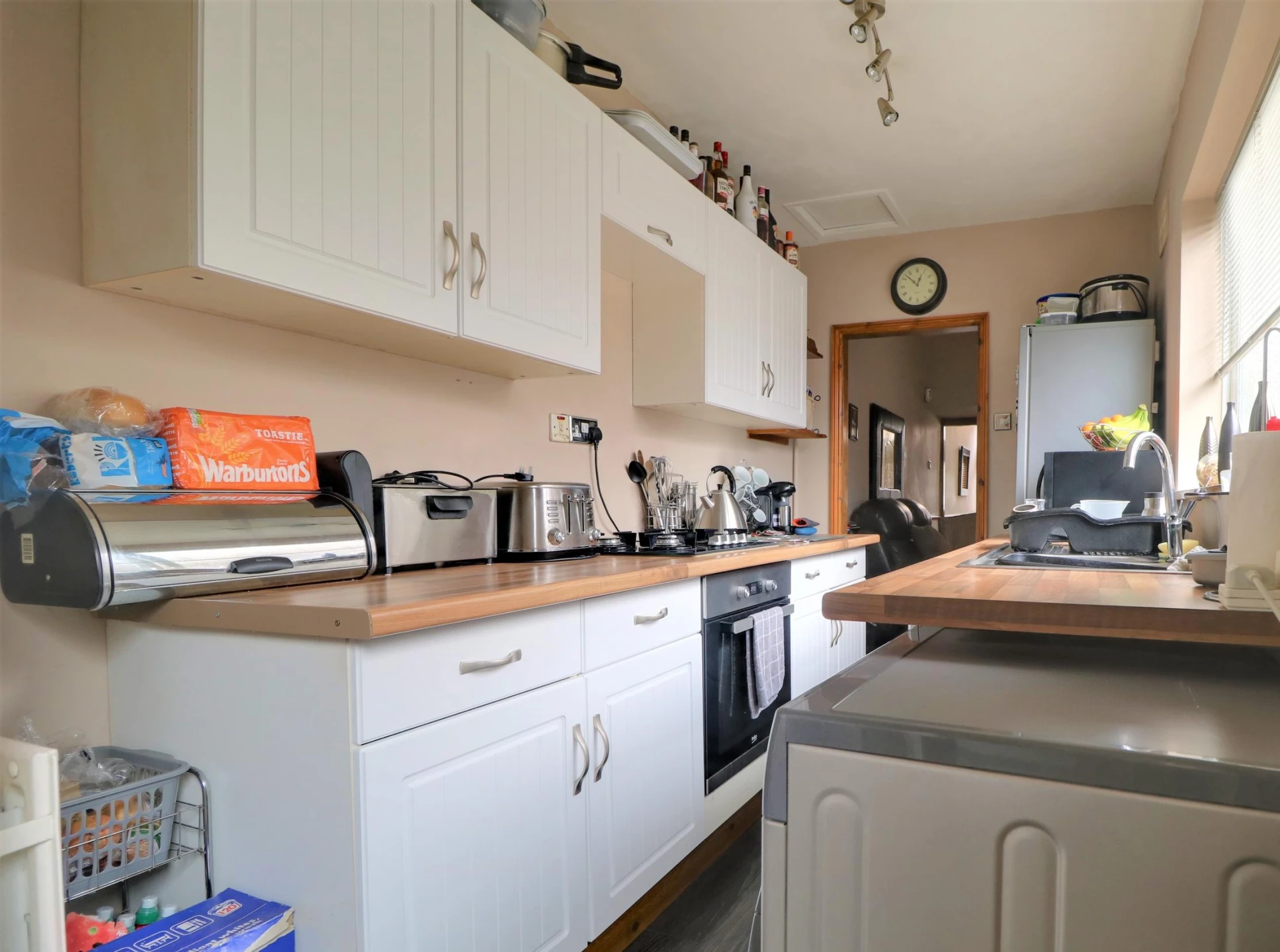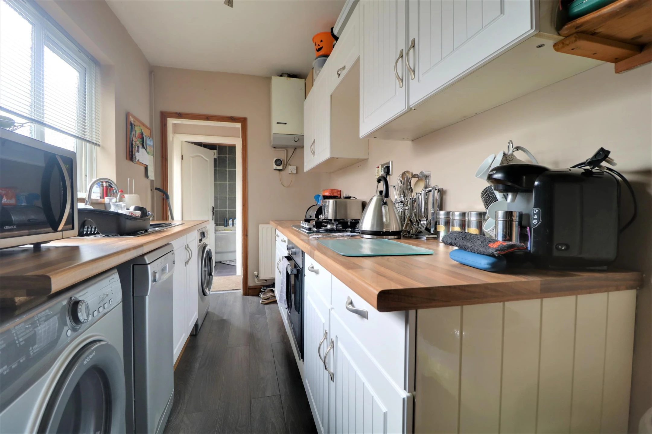 A range of wall and base units with complimentary worksurfaces, stainless steel one and a half sink drainer with chrome mixer tap, integral electric oven and gas hob. Upvc double glazed window to the side aspect, spaces for a fridge/freezer, dishwasher washing machine and tumble dryer. Wall mounted boiler, radiator and laminate flooring.
