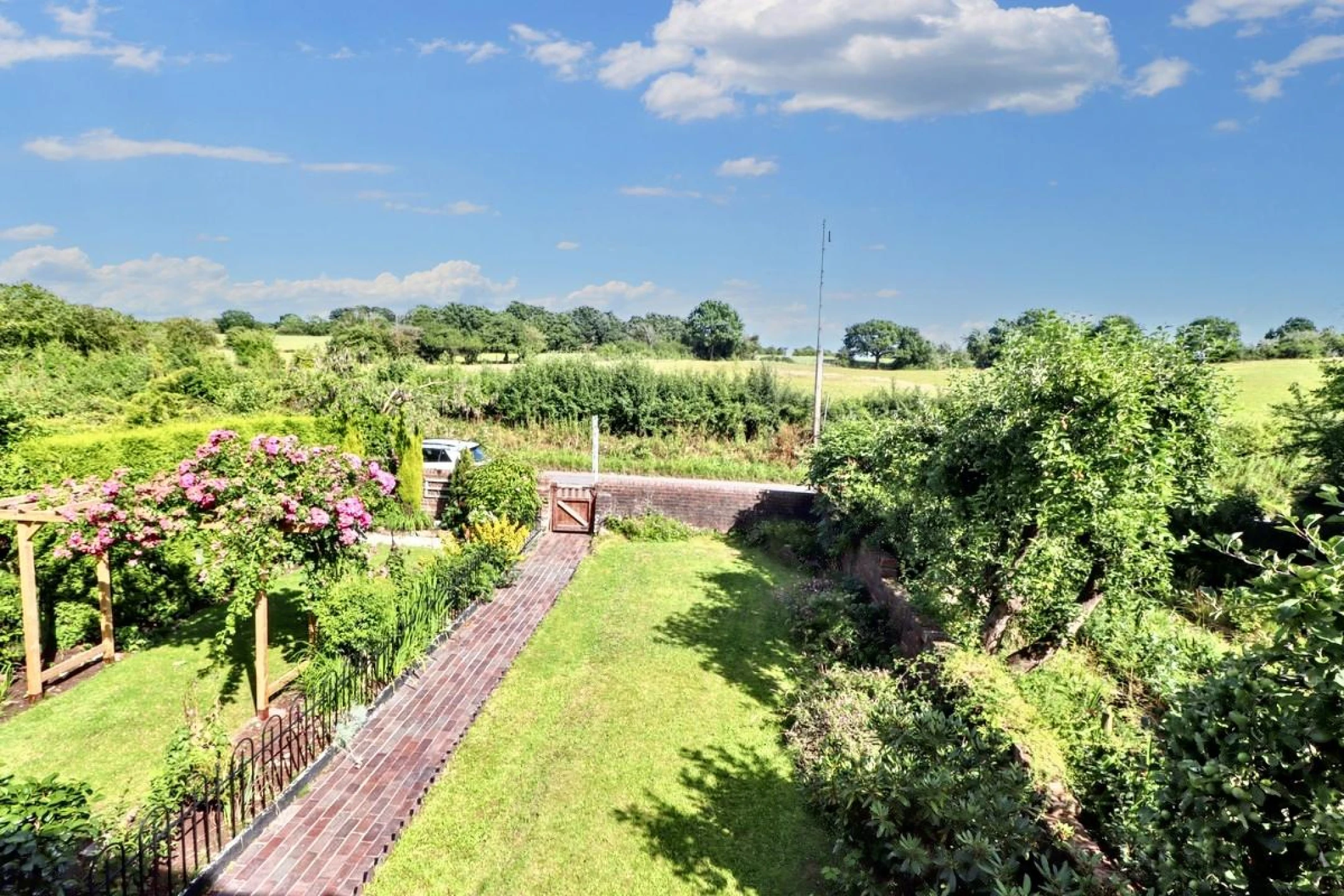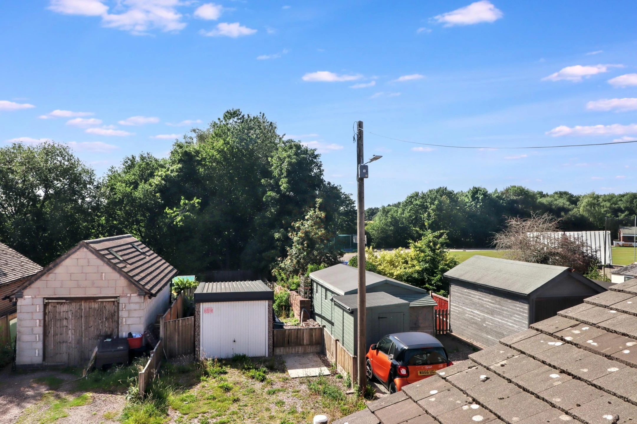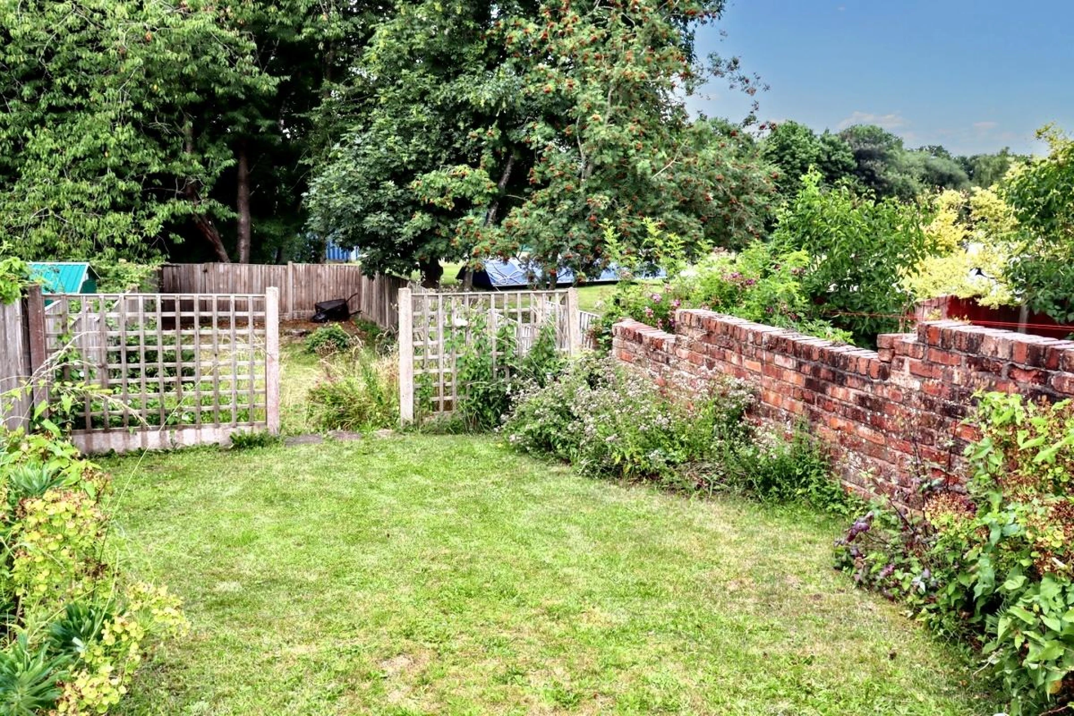 To the rear, a stable door leads to a private yard with wooden gate . Across the access road the property includes a brick-built garage with off street parking. Beyond lies a second garden area that enjoys a peaceful outlook over mature trees, providing an additional outdoor retreat.
