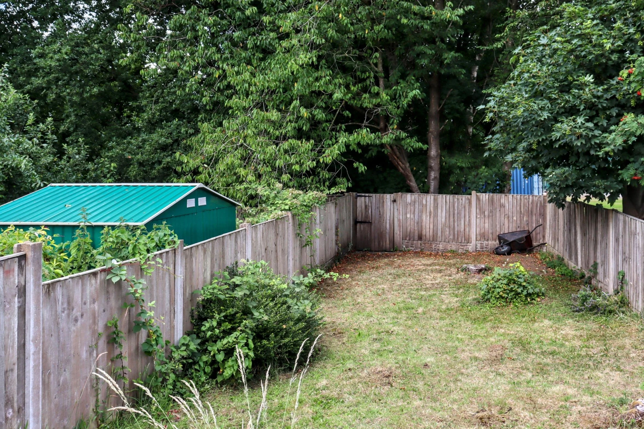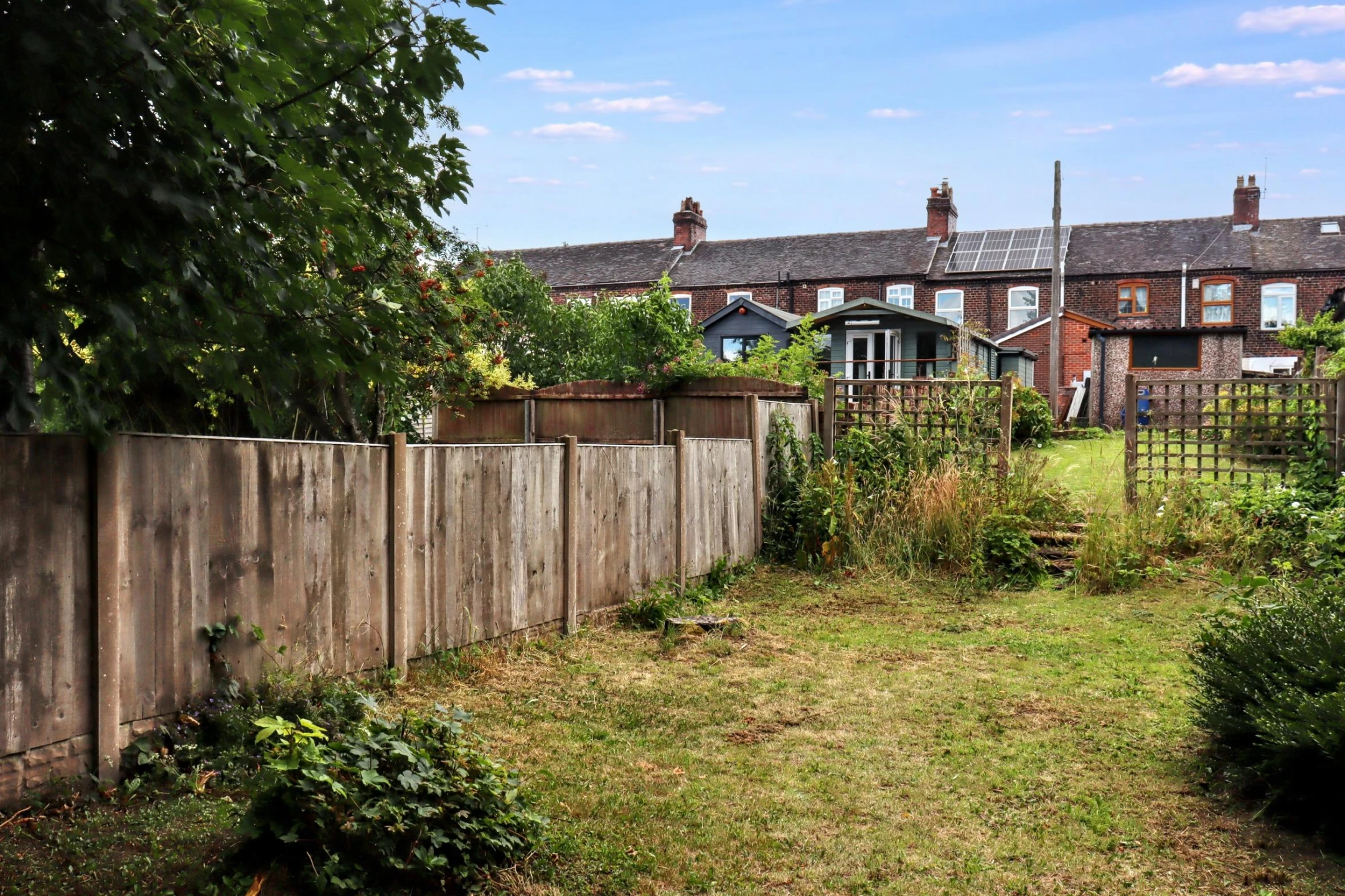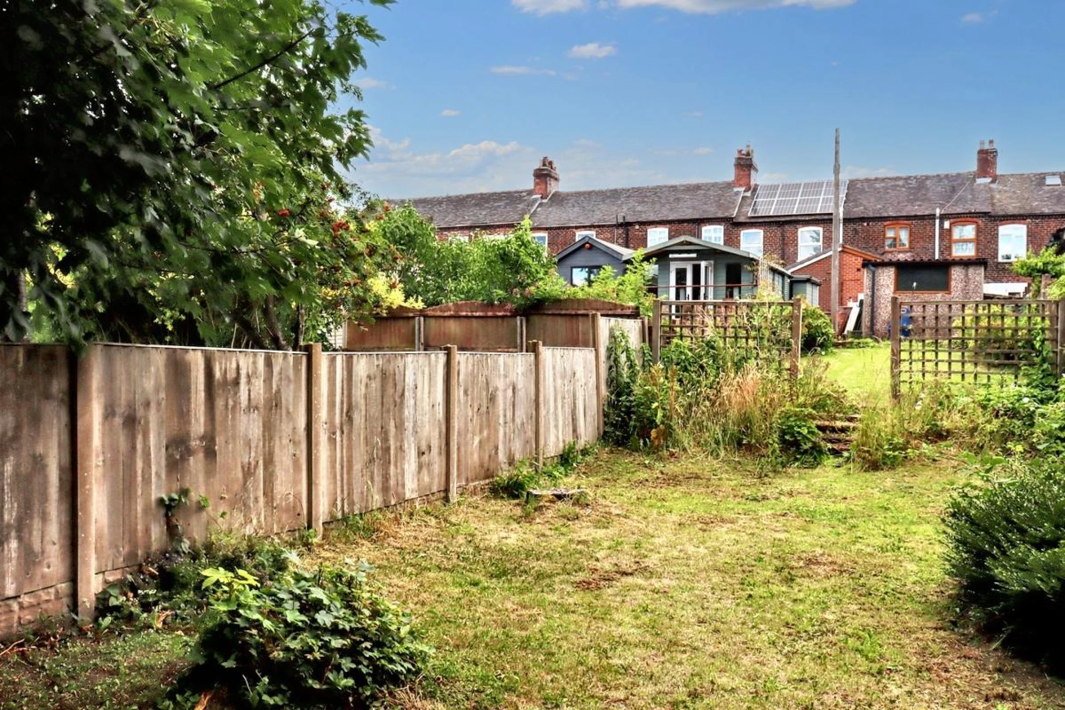 To the rear, a stable door leads to a private yard with wooden gate . Across the access road the property includes a brick-built garage with off street parking. Beyond lies a second garden area that enjoys a peaceful outlook over mature trees, providing an additional outdoor retreat.
