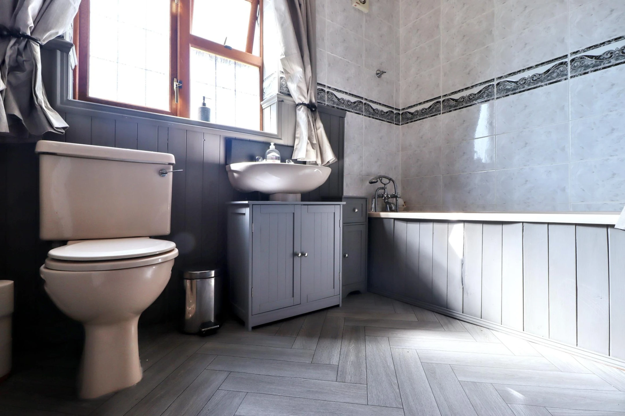 Upstairs, you’ll find two generous double bedrooms and a well-appointed bathroom fitted with a white suite and stylish half-tiled walls. Views across farmland