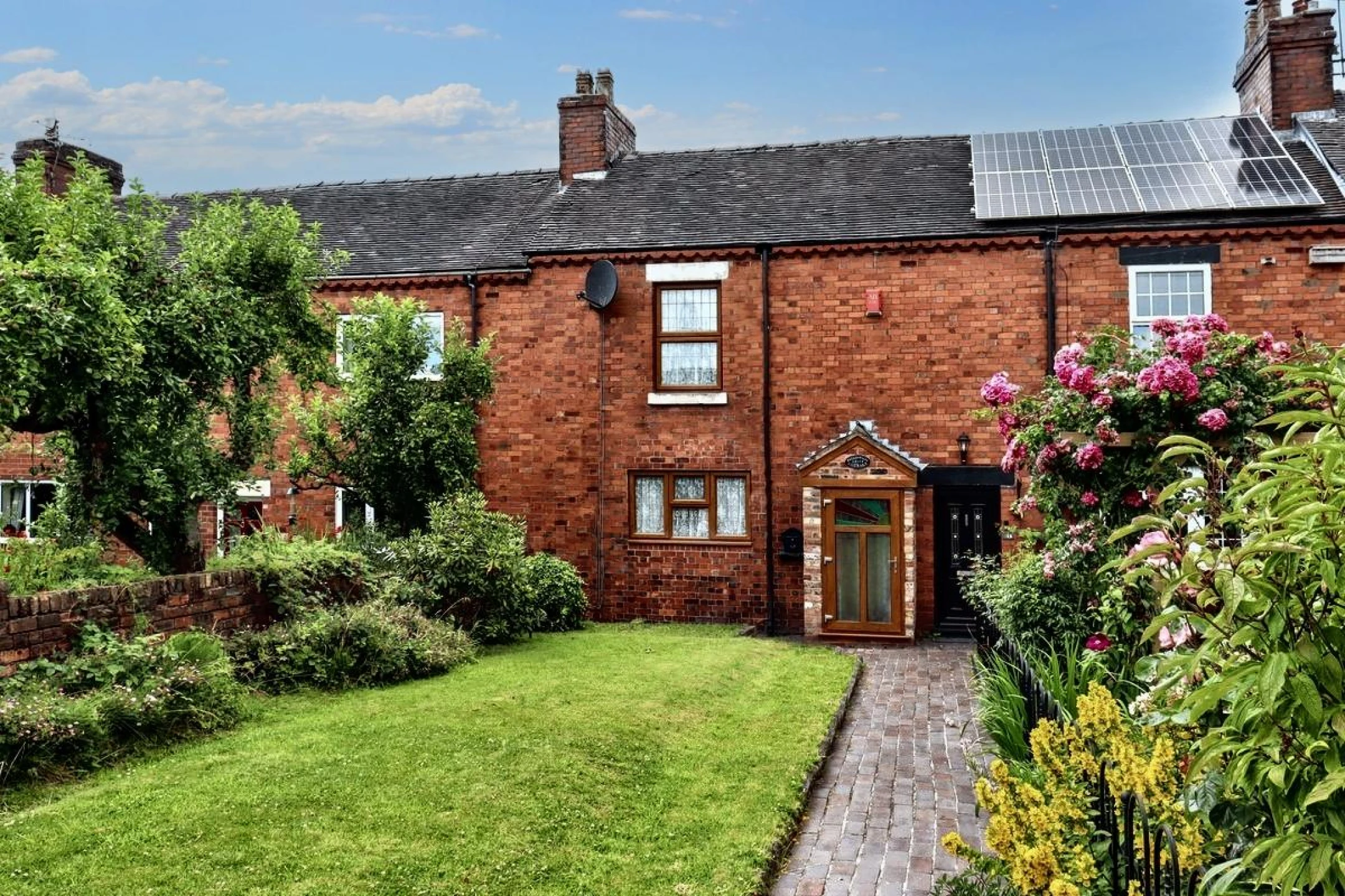 Nestled in a row of similar properties next to Leycett Cricket Ground, this delightful mid-terraced cottage offers a wonderful blend of charm and practicality. The cottage is set behind a generous walled front garden, lawned with an attractive variety of shrubs, complemented by a block-paved path leading to the front door.