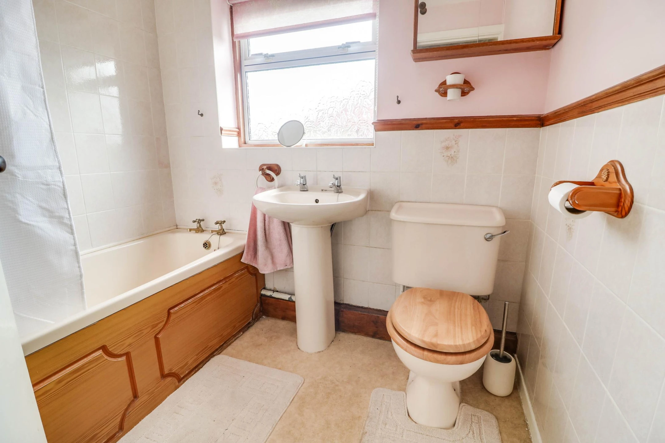 With double glazed window to the rear elevation, panelled bath with shower attachment over, wc, wash hand basin and cushioned flooring.