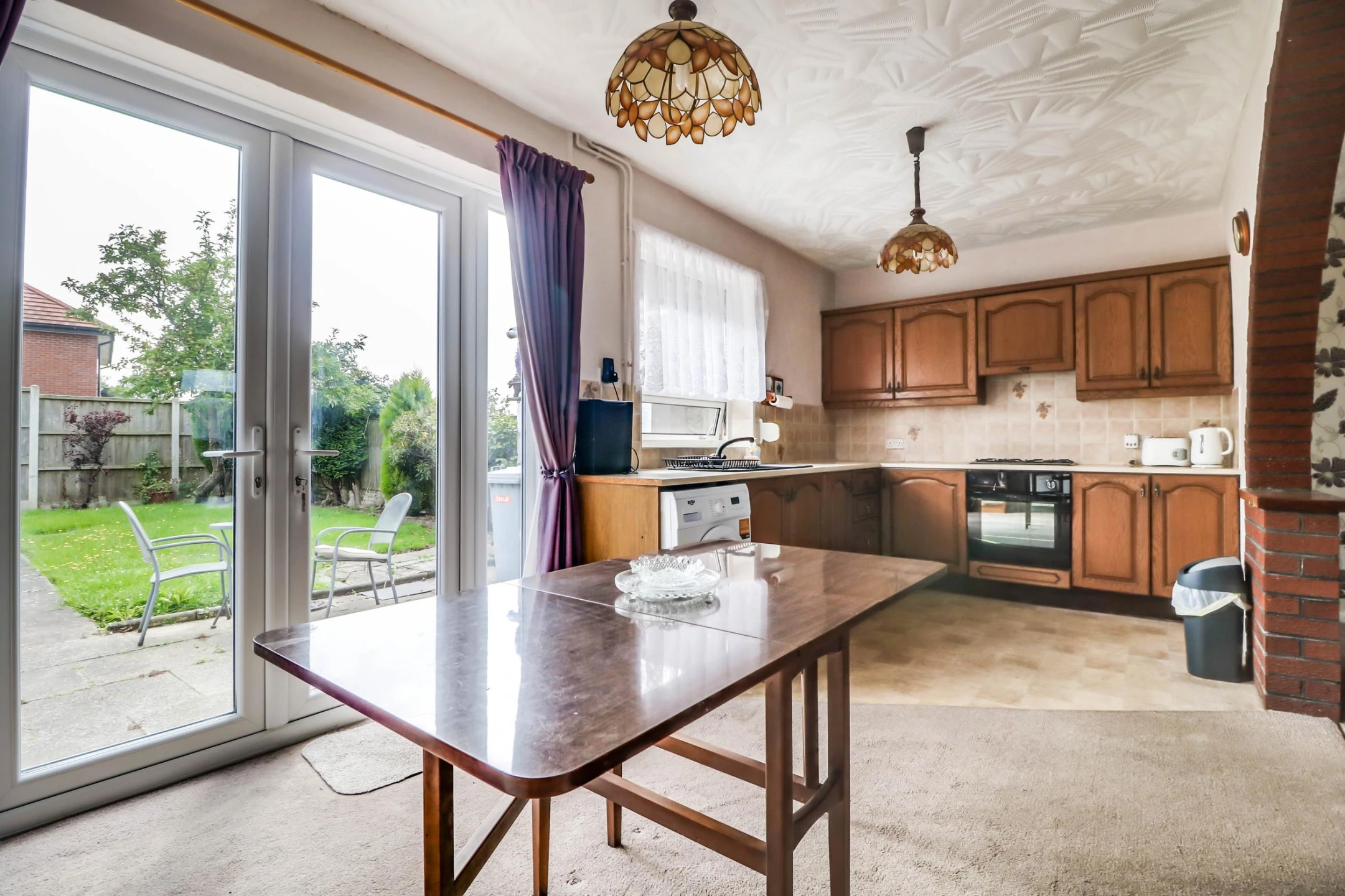 With double glazed glazed window and new french doors leading to the rear private garden a range of matching wall and base units with work surfaces over, inset sink and drainer, electric oven with gas hob and extractor fan over, space for washer/dryer, spacious pantry, part fitted carpets and cushioned flooring.