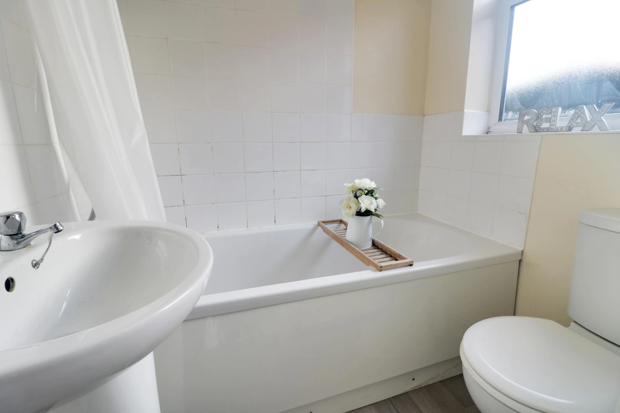 Fitted with panelled bath with shower over, wash hand basin and W.C. Part tiled walls, window to the side, radiator.