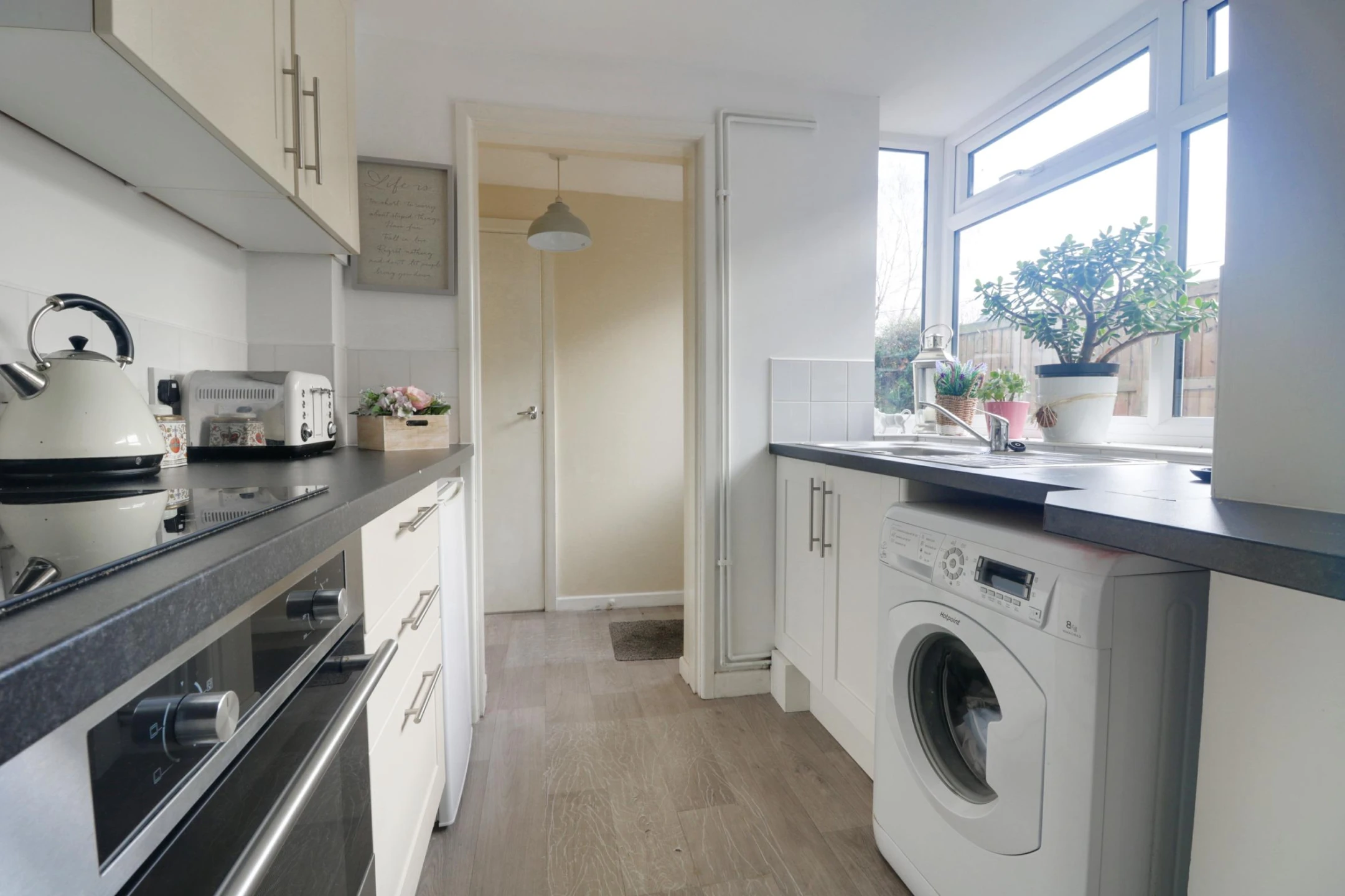 Recently refitted with a range of cream wall, base and drawer units with a single drainer sink unit with mixer taps. Fitted with a four burner electric hob with extractor fan, recess for washing machine. Window to the side, door to the rear hall.
