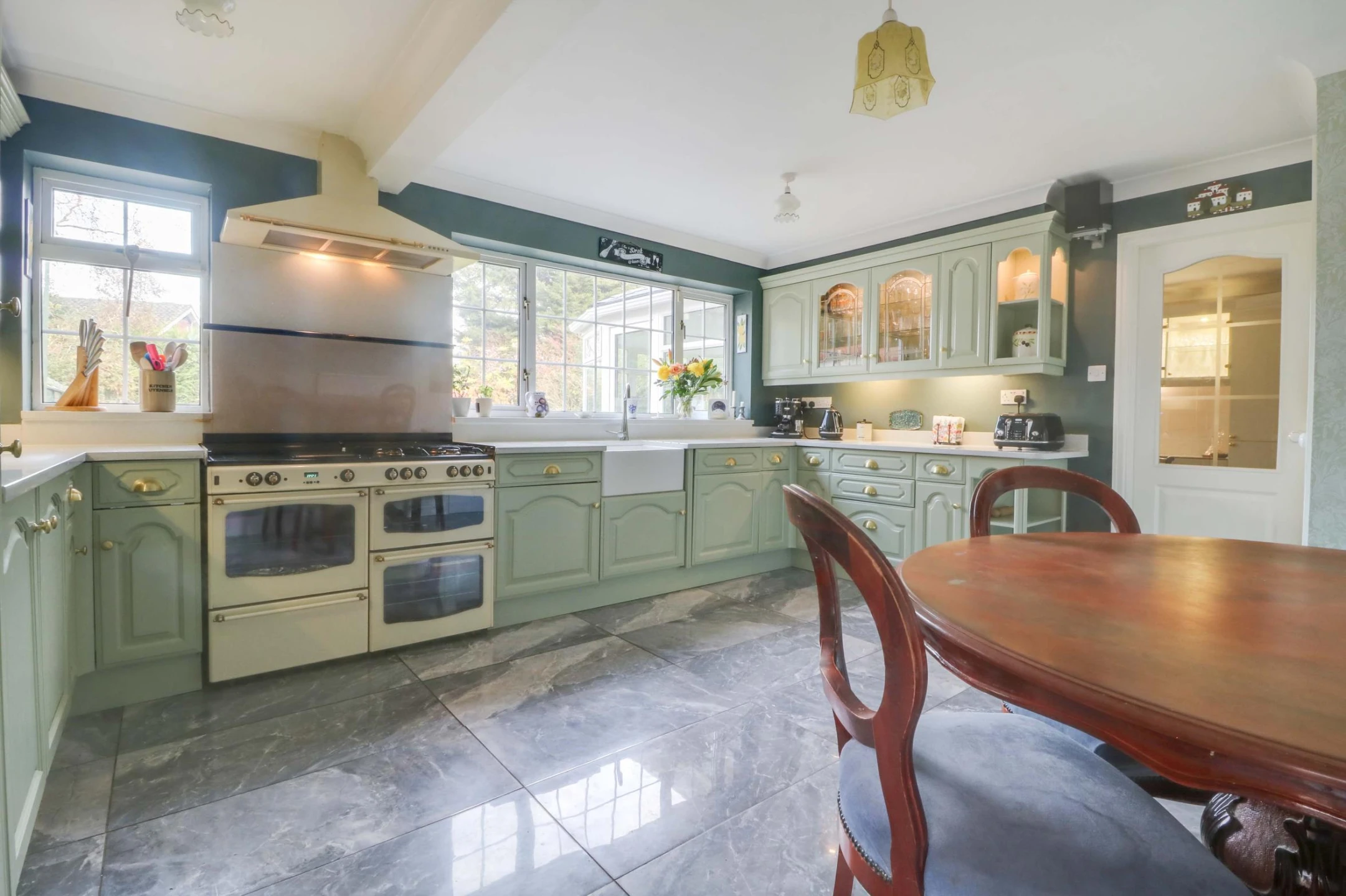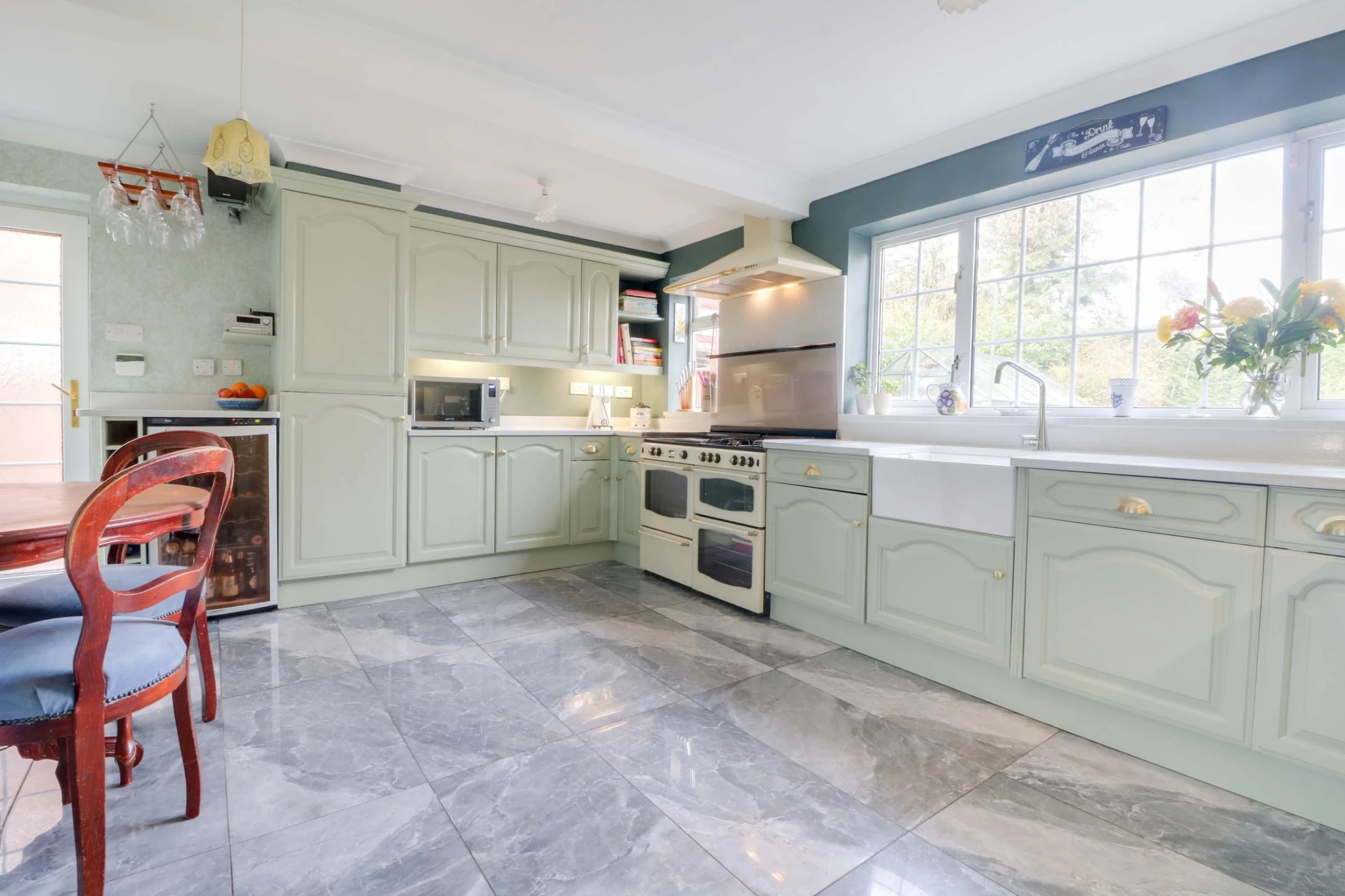 With double glazed windows to the rear elevation a range of solid oak wall and base units with granite work surfaces over, new Belfast sink, integrated wine fridge, fridge/freezer, multi fuel range cooker, dishwasher, turkish porcelain flooring and radiator.