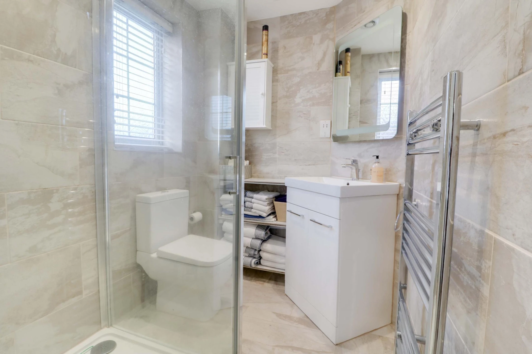 With double glazed window to the side elevation, shower enclosure, wash hand basin with storage underneath, w.c. with push button flush, floor to ceiling ceramic tiles, ceiling spotlights and heated chrome ladder radiator.