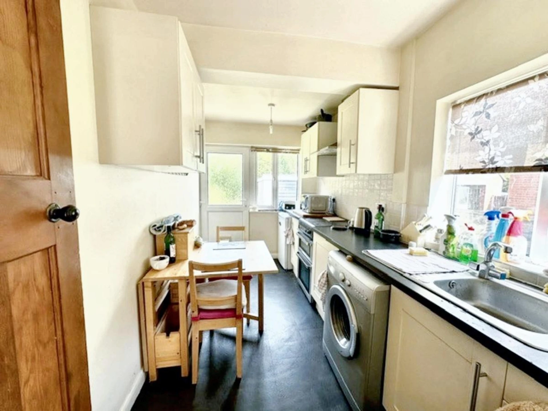 Fitted with base and wall units, with direct access to the rear garden. Offers scope for updating or reconfiguring to suit modern tastes