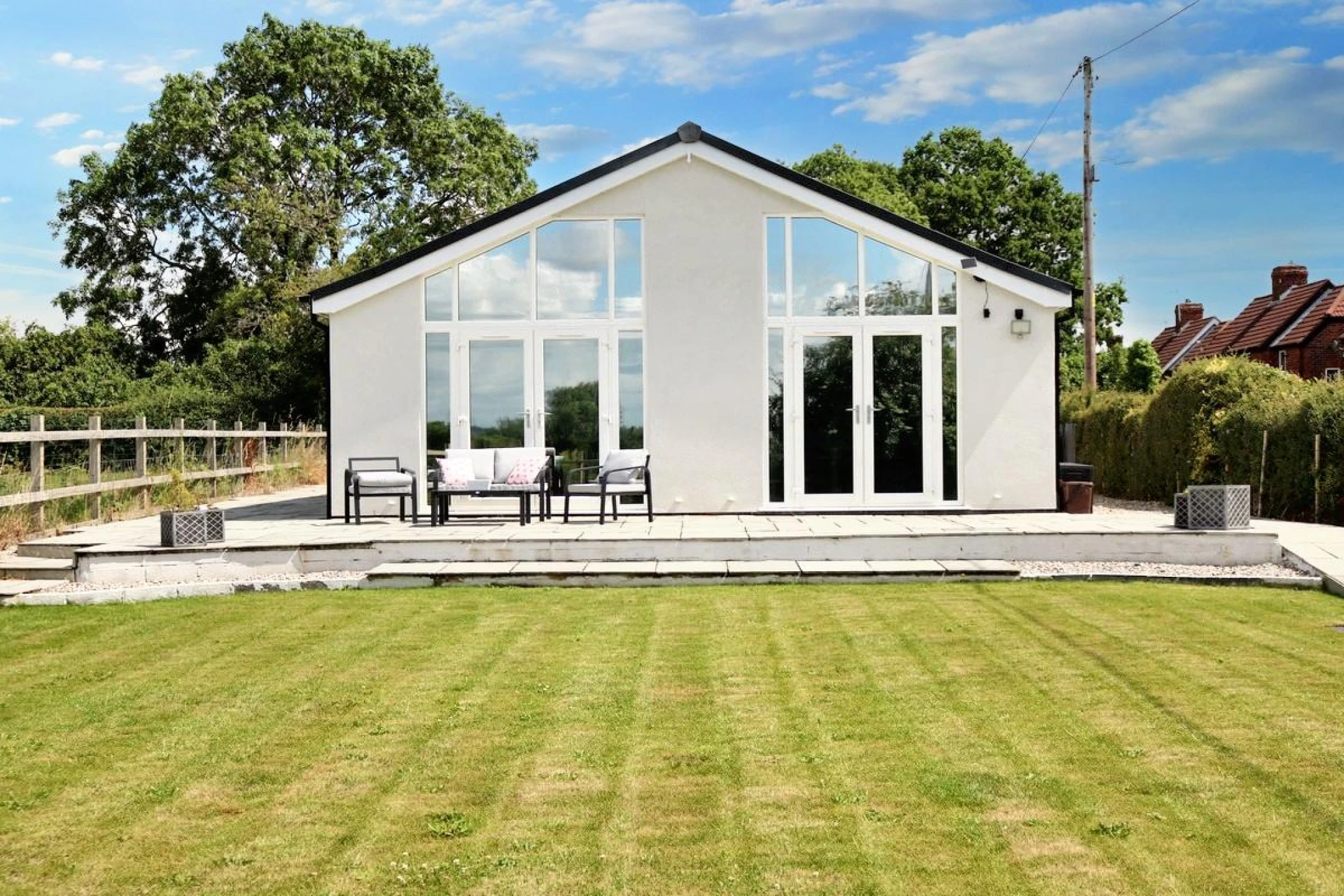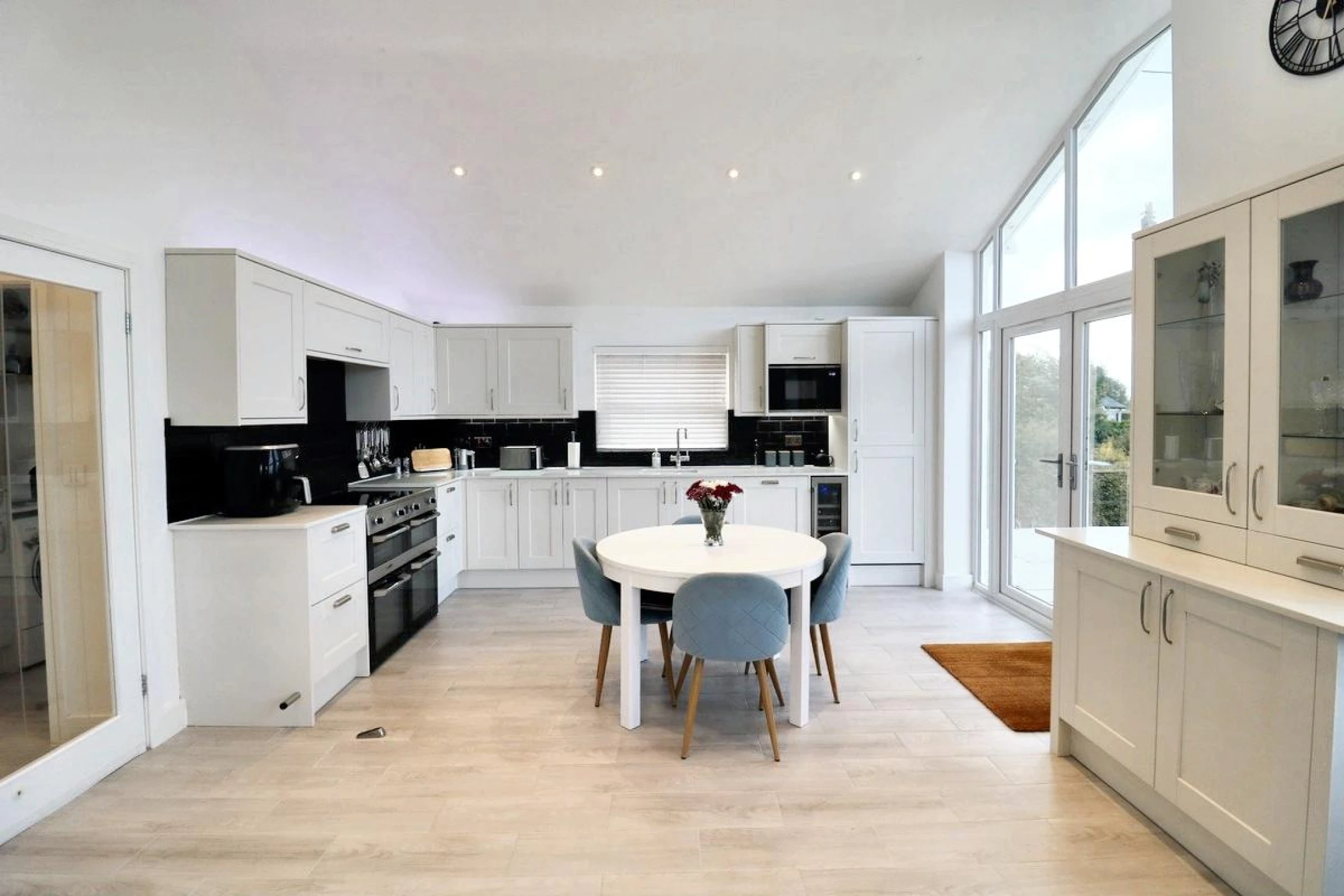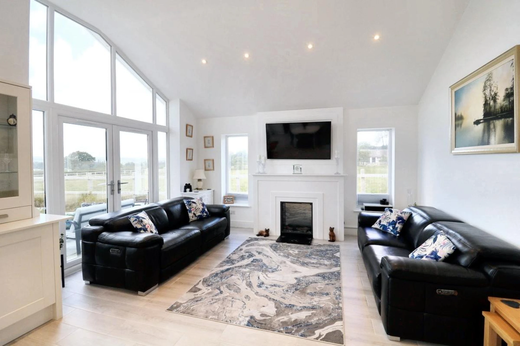 A welcoming, light-filled space with large glass windows and doors that open directly onto the garden, creating a seamless indoor-outdoor flow. Ideal for relaxing or entertaining, with stunning views of the open countryside. The modern fitted kitchen is stylish and fully fitted with premium fixtures and fittings, the kitchen offers ample storage, integrated appliances, and a sleek design that complements the open-plan layout.