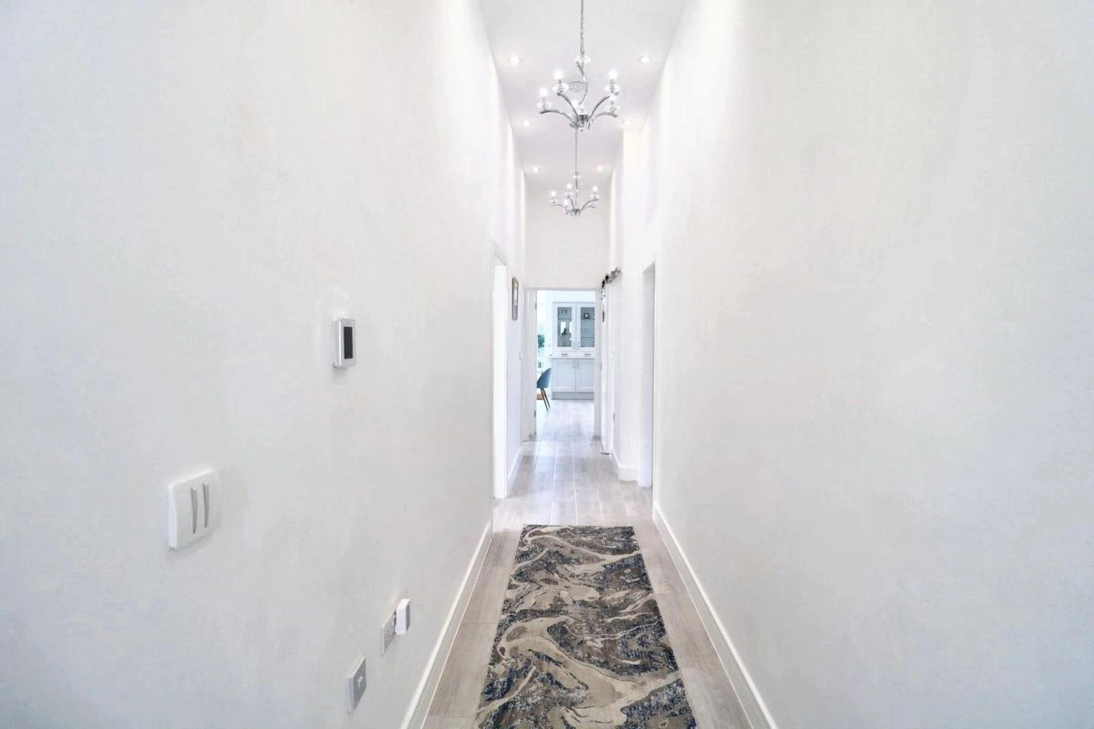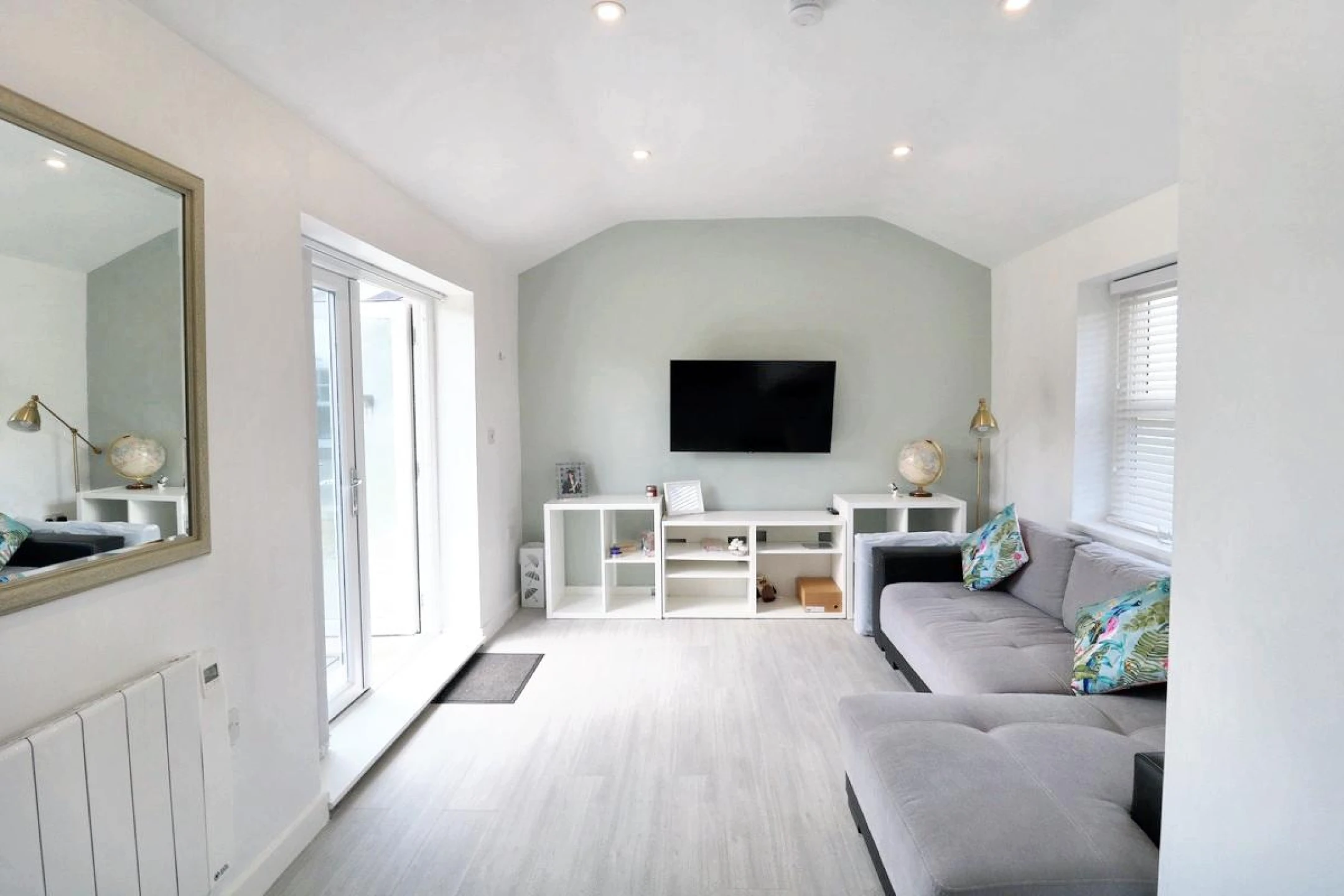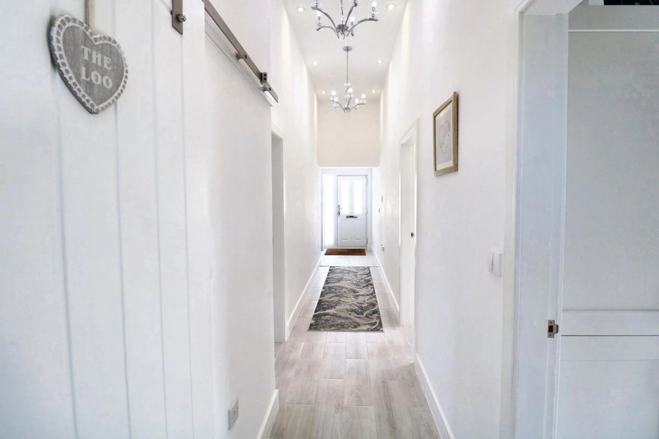 The property opens into the spacious entrance hall with tilled flooring and doors through to the bedrooms and living area.