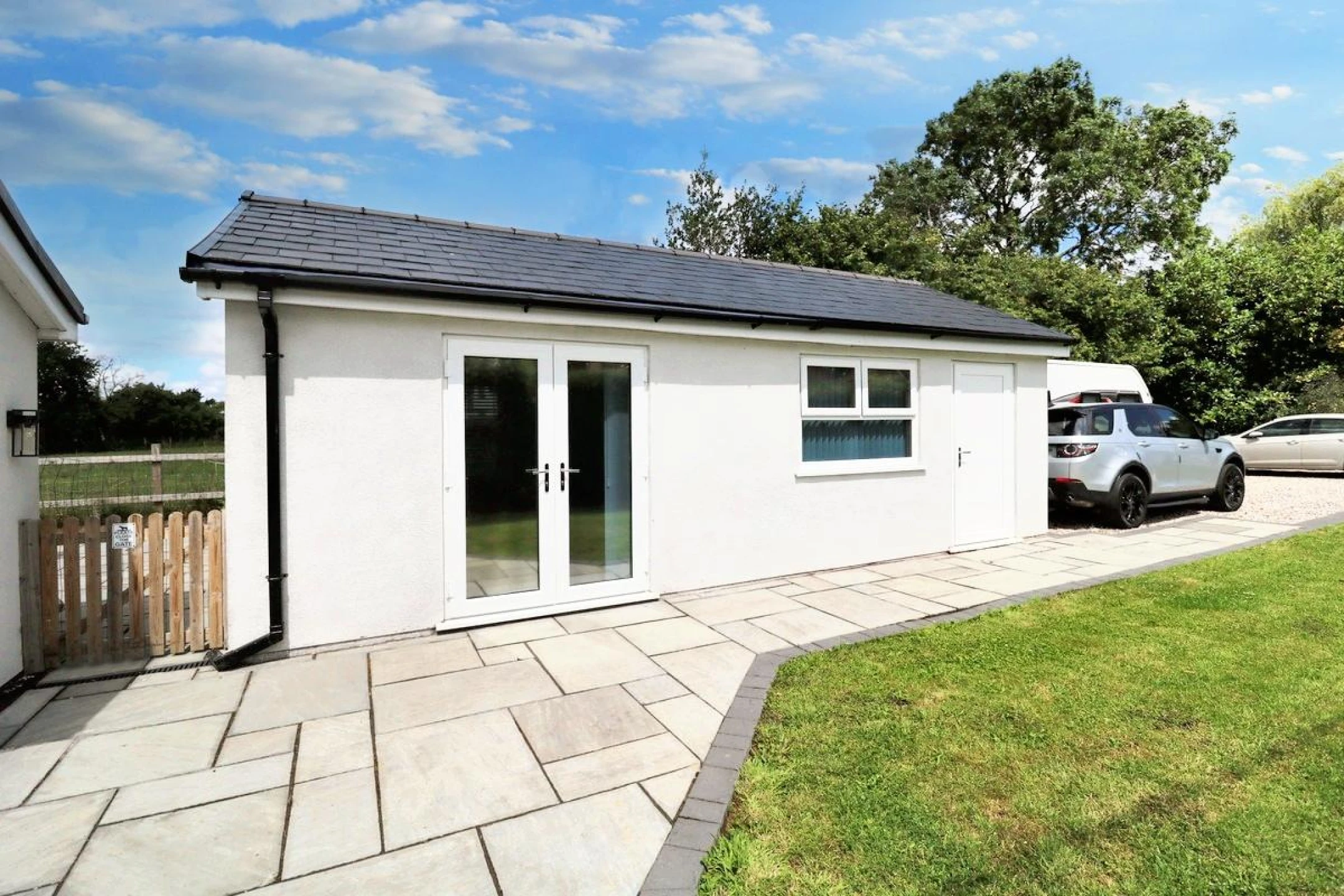 The property features two generous double bedrooms, including a master suite with a stylish ensuite bathroom. The open-plan living and dining area is bright and spacious, with large glass windows and doors that open onto the garden — perfect for enjoying the spectacular open countryside views. The modern kitchen boasts high-quality fixtures and fittings throughout, making it ideal for both everyday living and entertaining.